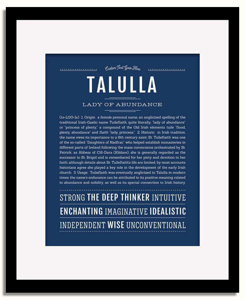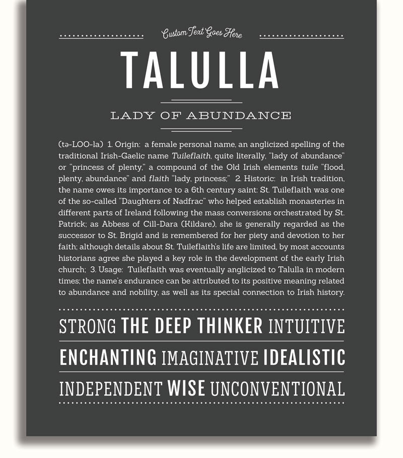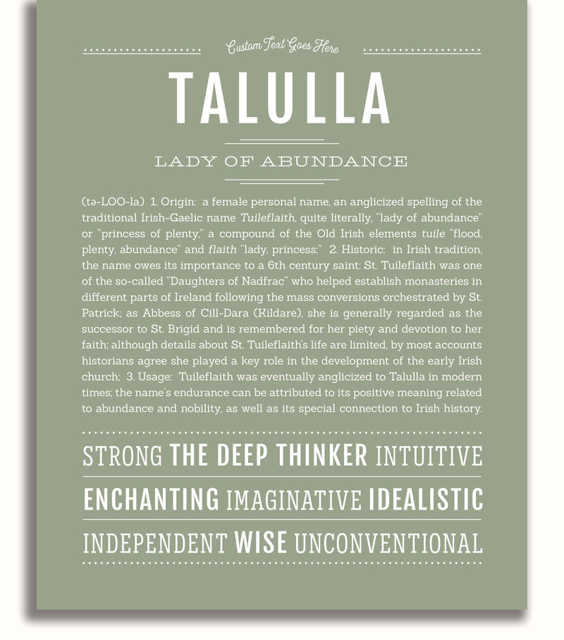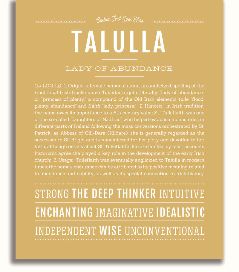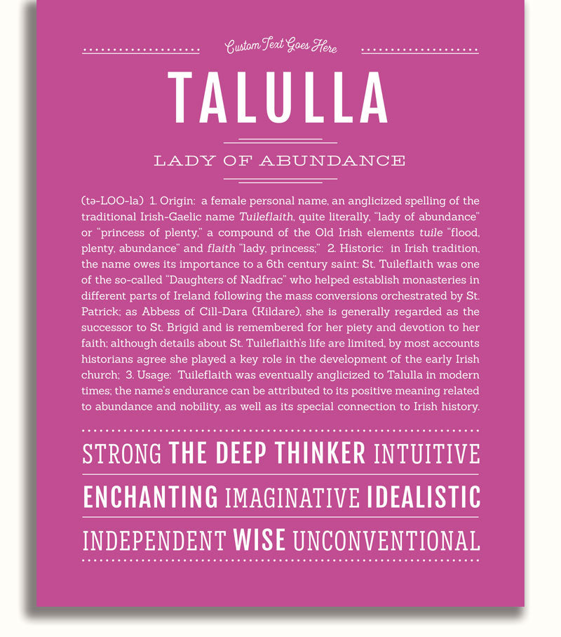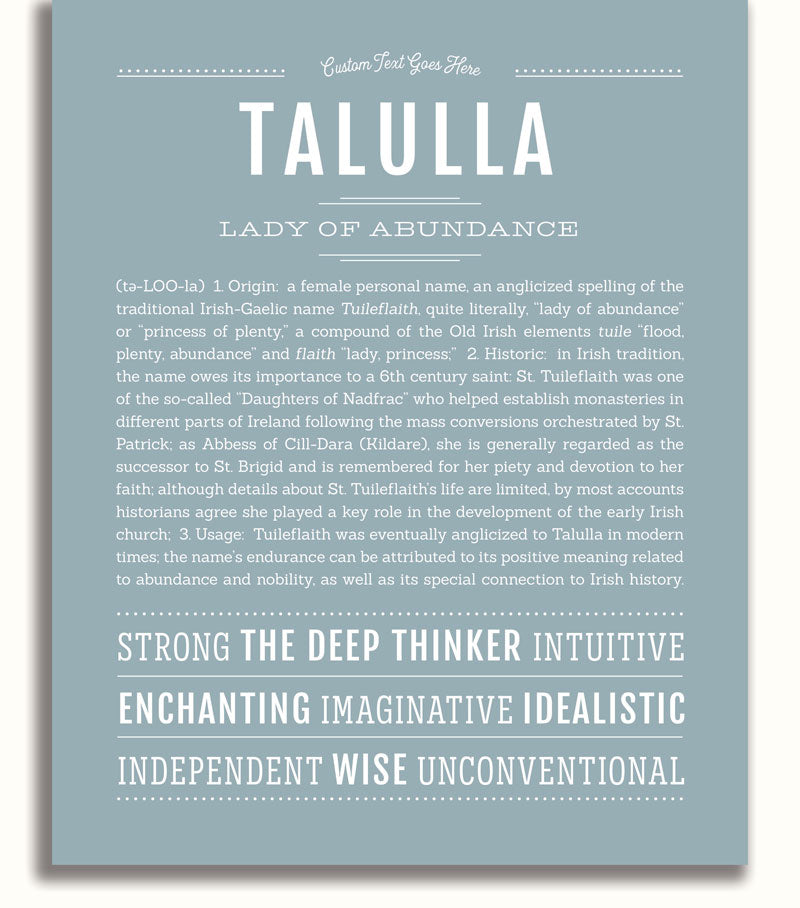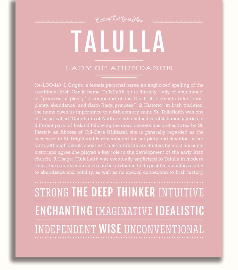 Names Stories® is not only a timeless keepsake of Talulla’s name, but a thoughtful reminder of who Talulla is: today, tomorrow, and always.